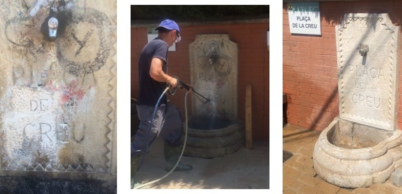 Per fer una neteja exhaustiva de la font de pedra i no malmetre la superfície a netejar, fent servir un producte desincrustant ecològic, i amb projecció de silicats i aigua a alta pressió, eliminem tota la pintura del graffiti, i aconseguint també treure les taques per contaminació i les que pel pas del temps sense fer cap manteniment havien aparegut.