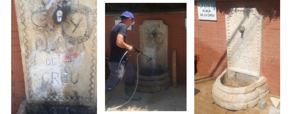 Como que en «Grafitinet tenemos mucha experiencia en la limpieza de superficies de piedra natural» (limpiamos fachadas de piedra de edificios históricos), el resultado final es una restauración de la Fuente de Agua a su estado original, totalmente limpia y sin señales por la actuación efectuada.
