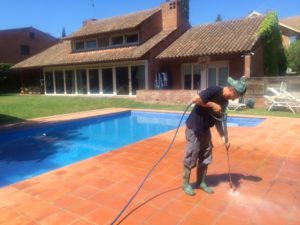 Para realizar esta limpieza optamos por un desincrustante específico, respetuoso con el material y especial para dichos suelos, y el uso de utensilios profesionales aptos para este tipo de suelos, junto con una hidro-limpiadora de alta presión profesional.
